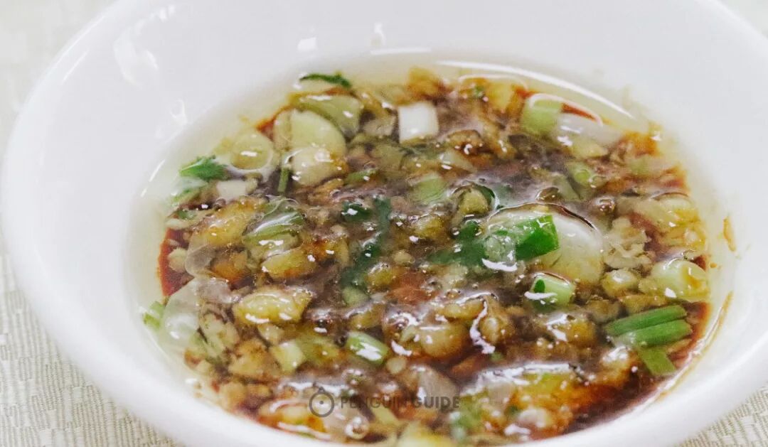 粥水锅的蘸碟组成很简单:葱姜丝(碎)、生抽和花生油,只提鲜不抢味。