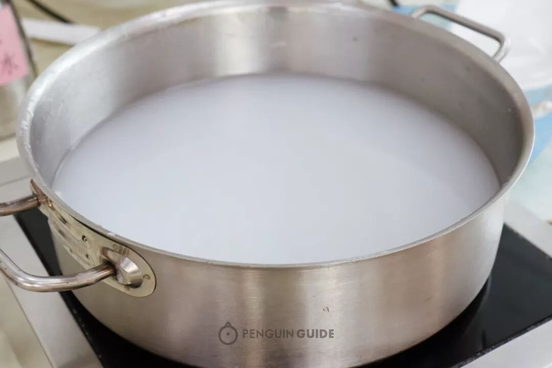 稻米用油抓匀,丢进一口大锅里煮至少三个小时,直到米粒颗颗开花、顺滑起胶,米汤色白如浆,才能成为合格的“火锅底料”。