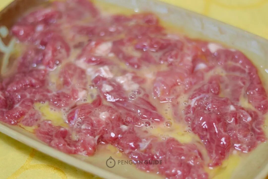 用鸡蛋捞匀过的牛肉,口感变得更加柔软。顺德人描述食物的词汇中,有一个很有意思的形容,叫做“滑”——