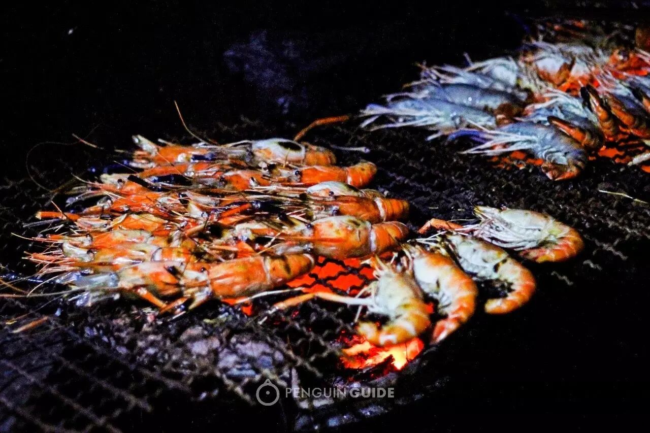 这里还有各种油爆的海鲜爆炒,个大肉厚的海鲜们和红辣椒、青咖喱一起在油锅里翻滚;海鲜烧烤用未加任何调料的海虾以明火烤透,虽然外皮会有些黑焦,但内里的肉质却瓷实鲜嫩,再沾着各种小料一起下肚,幸福感满满。