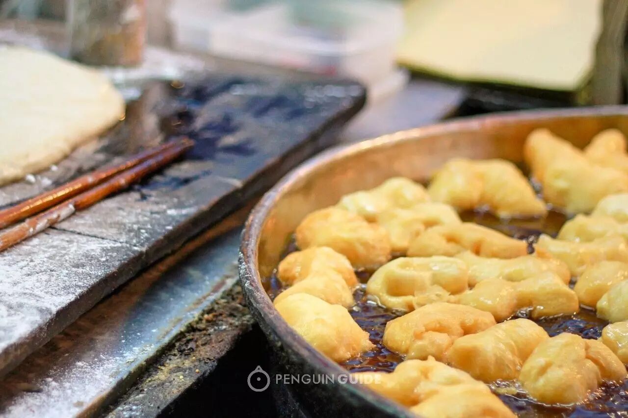 油条虽小却大有讲究:老板事先在面粉里加入了香兰叶(香兰叶是东南亚常用的香料之一,马来西亚的“娘惹”就喜欢把这种植物加入食物里)和芝士,然后放入油锅,一边炸一边不停地用筷子翻滚,直到炸成金黄色再捞出。