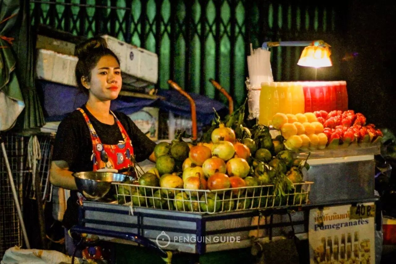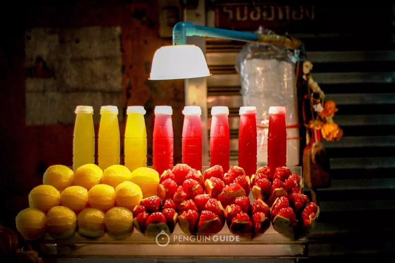 在曼谷闷热的夜晚,吃过一份辣辣的咖喱虾或些许油腻的炒粿条后,再灌下一整杯新鲜的果汁,瞬间爽到飞起来。