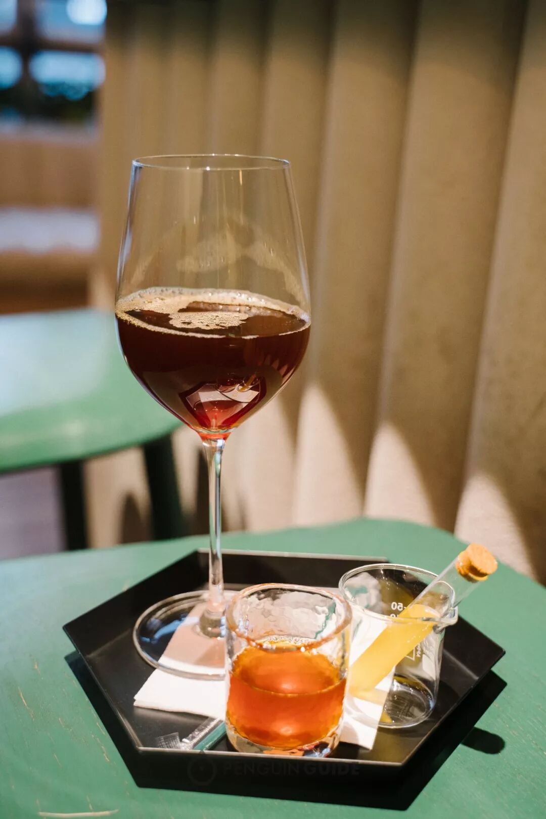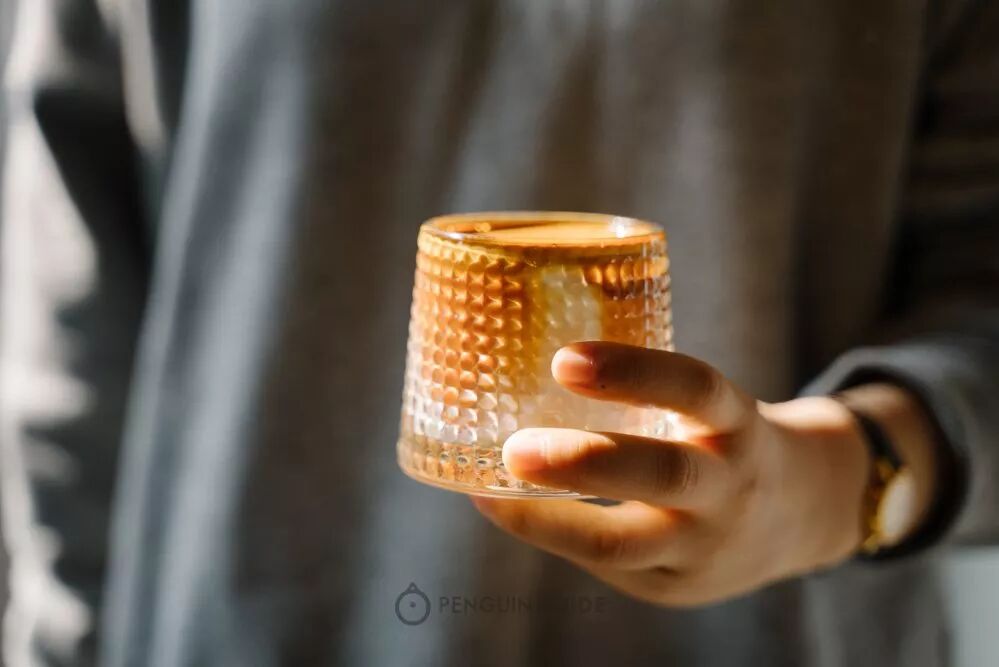红酒杯可以更好地闻香,先喝一口手冲,再喝一口小杯子里的混合体,然后根据喜好往酒杯里加糖浆,感受水果与咖啡风味的呼应与反差。