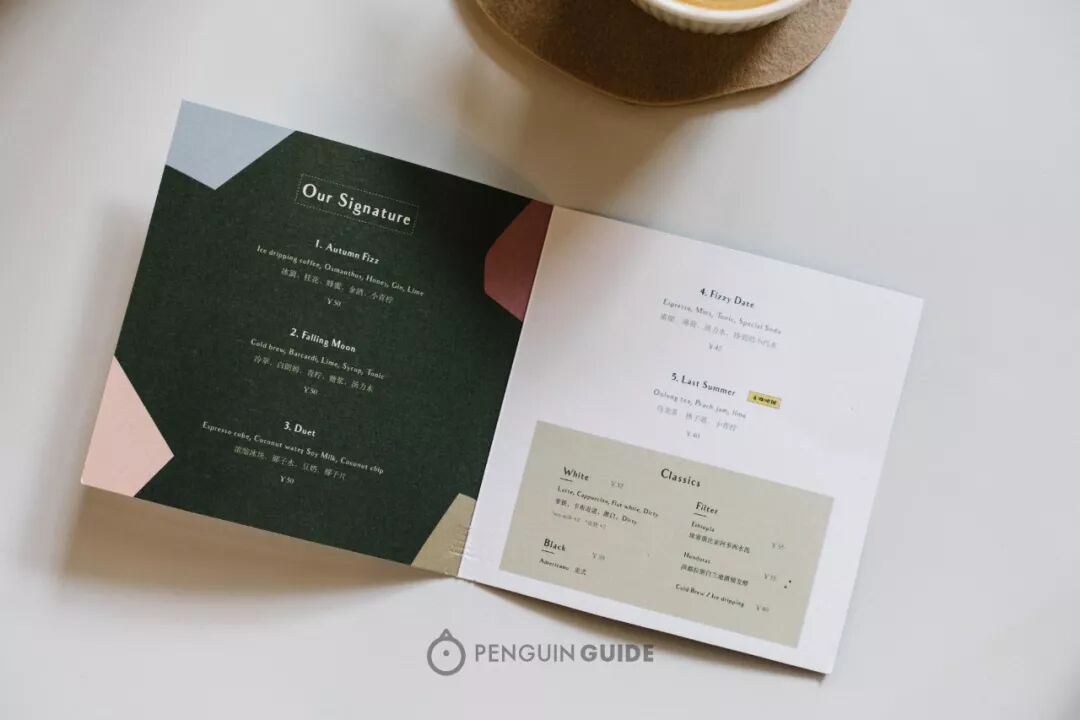 很喜欢Café Duet的菜单,比起好多精品馆字越来越长,越来越复杂的菜单,这张小册子算得上极简:选择不多,5款创意咖啡,2支手冲,还有常规的意式。