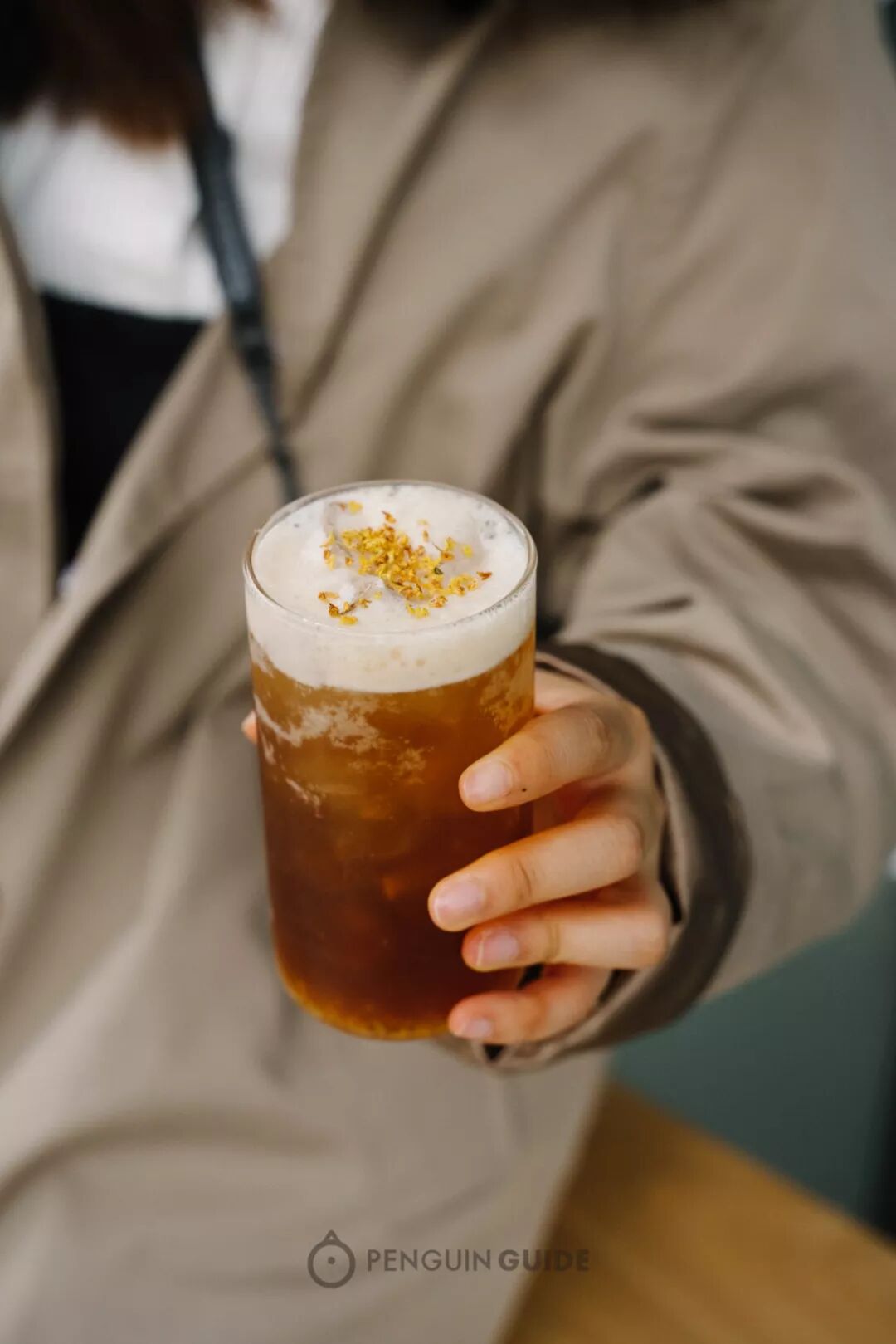 创意款Autumn Fizz,表面是细密柔软的气泡,撒一把干桂花,和咖啡的花香浅浅呼应。