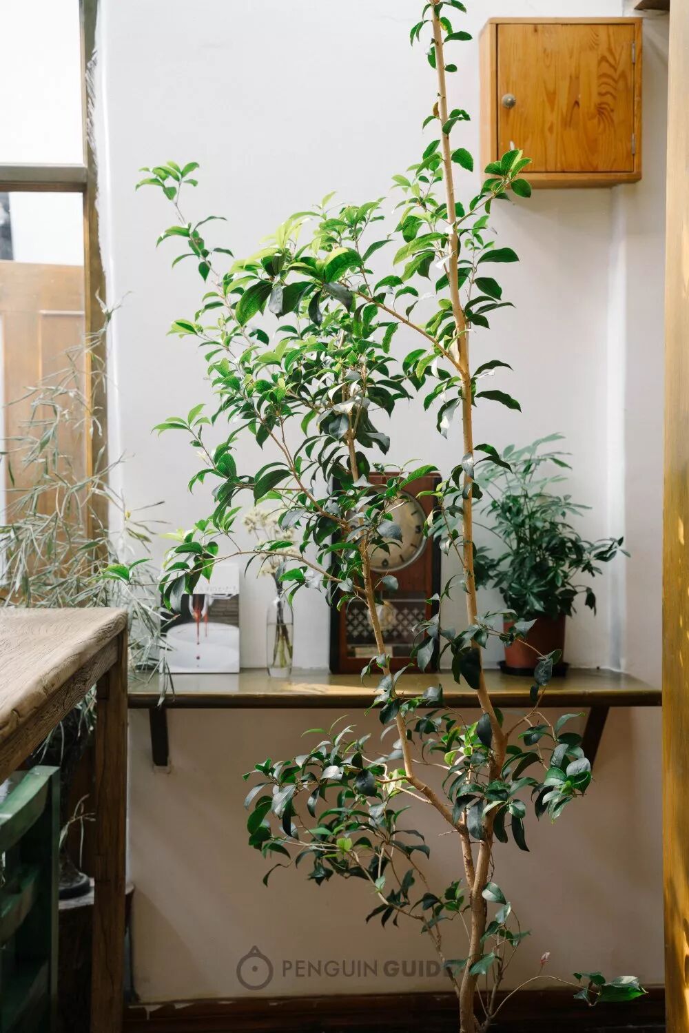 它坐落在胡同深处,有一间通透漂亮的天井,采光很好。屋子里有很多带着岁月痕迹的原木家具,据说是房子前主人留下的,零星点缀着绿意盎然的植物,玄关还种了一棵桂花……很有味道,每个角落都值得驻足。