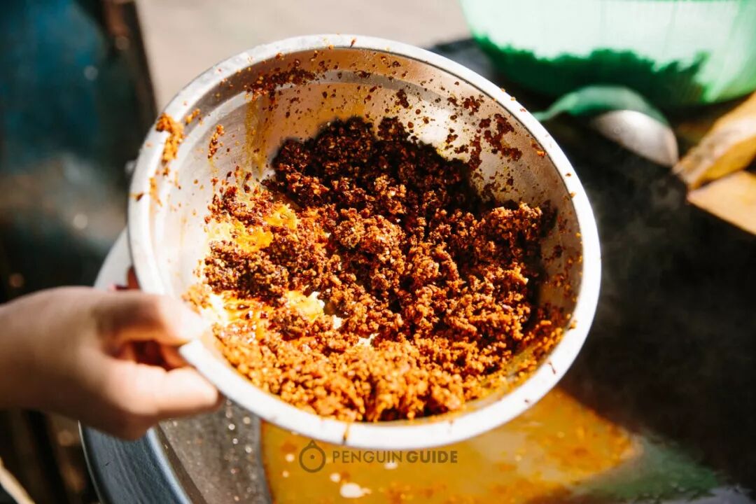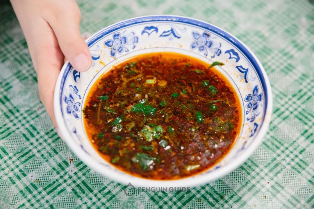 每家的红油都是自制的,将红辣椒在牛油里炸,满满的动物油脂裹上一层辣味,炸裂出浓香。红艳艳的颜色,往上面一撒,满口生津。