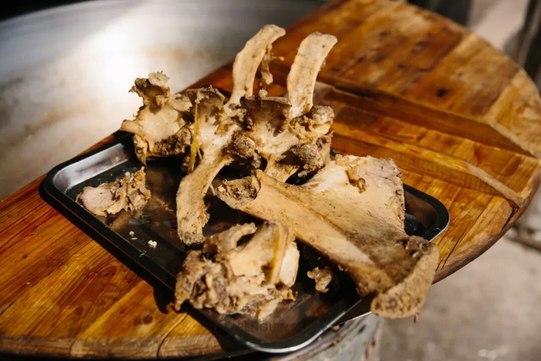 用的是江淮一带的黄牛,一头牛五六百斤,取牛骨头斩成几段,先用清水泡血污,再将骨头下锅熬煮,直到汤清味浓,才正式开始一天的头汤。