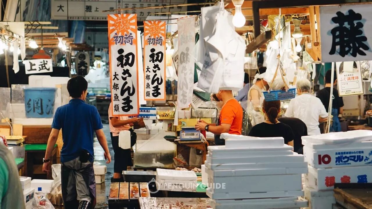 在筑地市场,金枪鱼采取从上盘商到中盘商的拍卖流通制度,拍卖于每日凌晨举行,当天到货的金枪鱼会在市场内整齐排开。凌晨4点,中盘商的买手开始检查鱼的质量,他们必须通过简单工具观察鱼的肉质,并迅速估出一条金枪鱼的品质。拍卖在5:30正式开始,双方通过只有业内人听得懂的行话,看得懂的手势,在短短时间内竞价结标,场面火爆又有趣。
