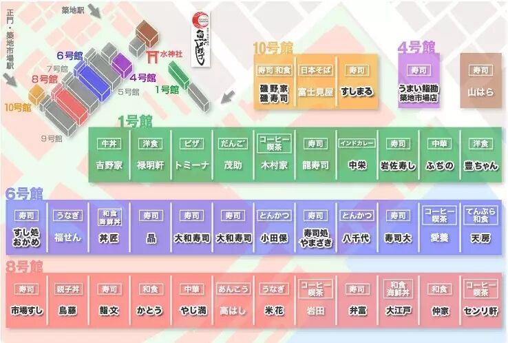 在上篇中已经说过,筑地的场内市场一般指的是批发市场及其附属建筑,简称场内。场内有几排餐饮店集中的建筑,便是“鱼河岸横丁”。