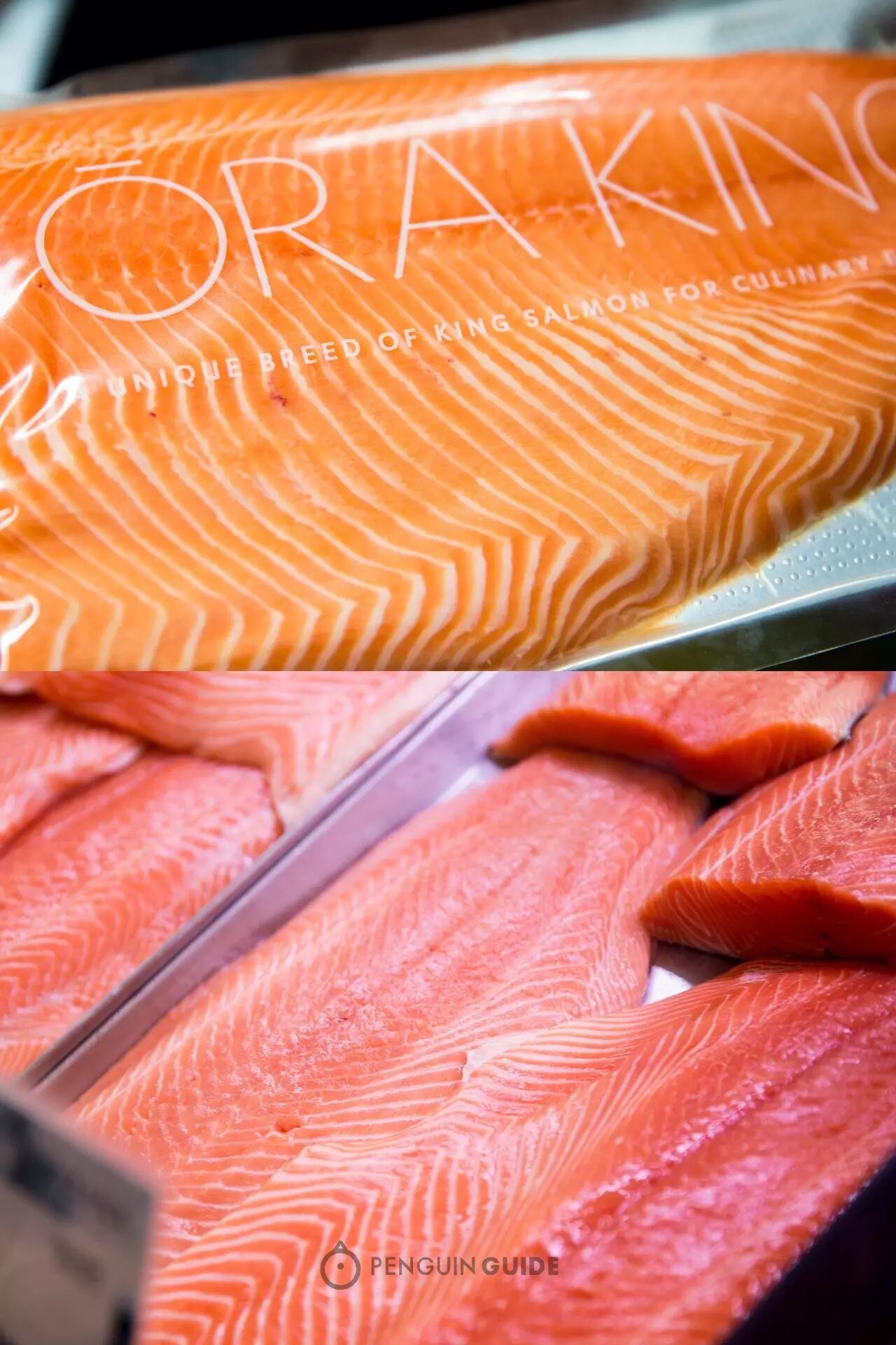 很多餐厅都会很自豪地标注自己用的是Ōra King Salmon——这是国王鲑的顶级品牌了。每一条都经过了严苛选择:从体型、色泽、肉质进行定级,获得认证的才能作为Ōra King Salmon出售。