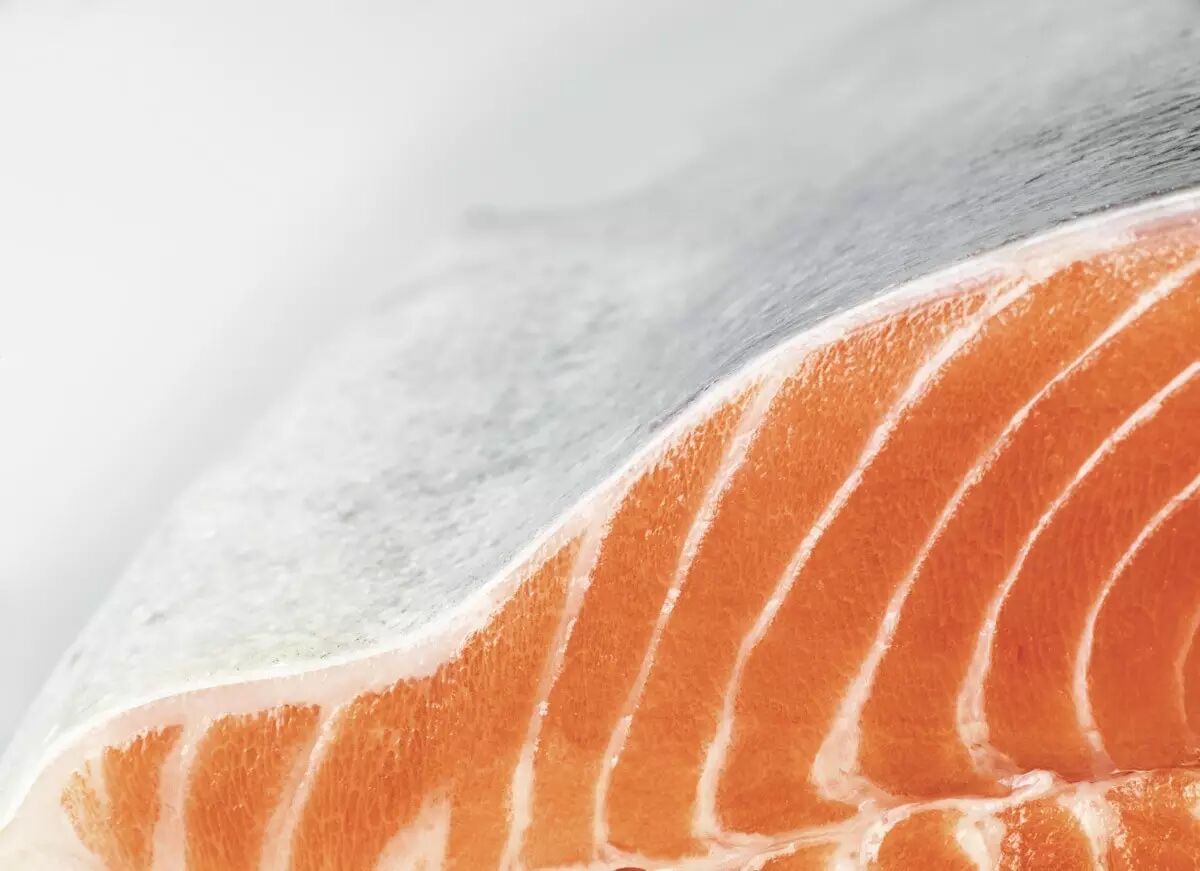 国王鲑的鱼皮是耀眼的银色,相比其他三文鱼,身体更胖更圆。鱼肉有着鲜艳的明橙色,分明的脂肪线划出大理石般的花纹:鱼肉中的油脂和Omega-3含量是所有三文鱼中最高的。三文鱼细腻滋润的口感得到了加强,鲜味优雅而深刻,柔和地包裹着舌头,余味悠长。
