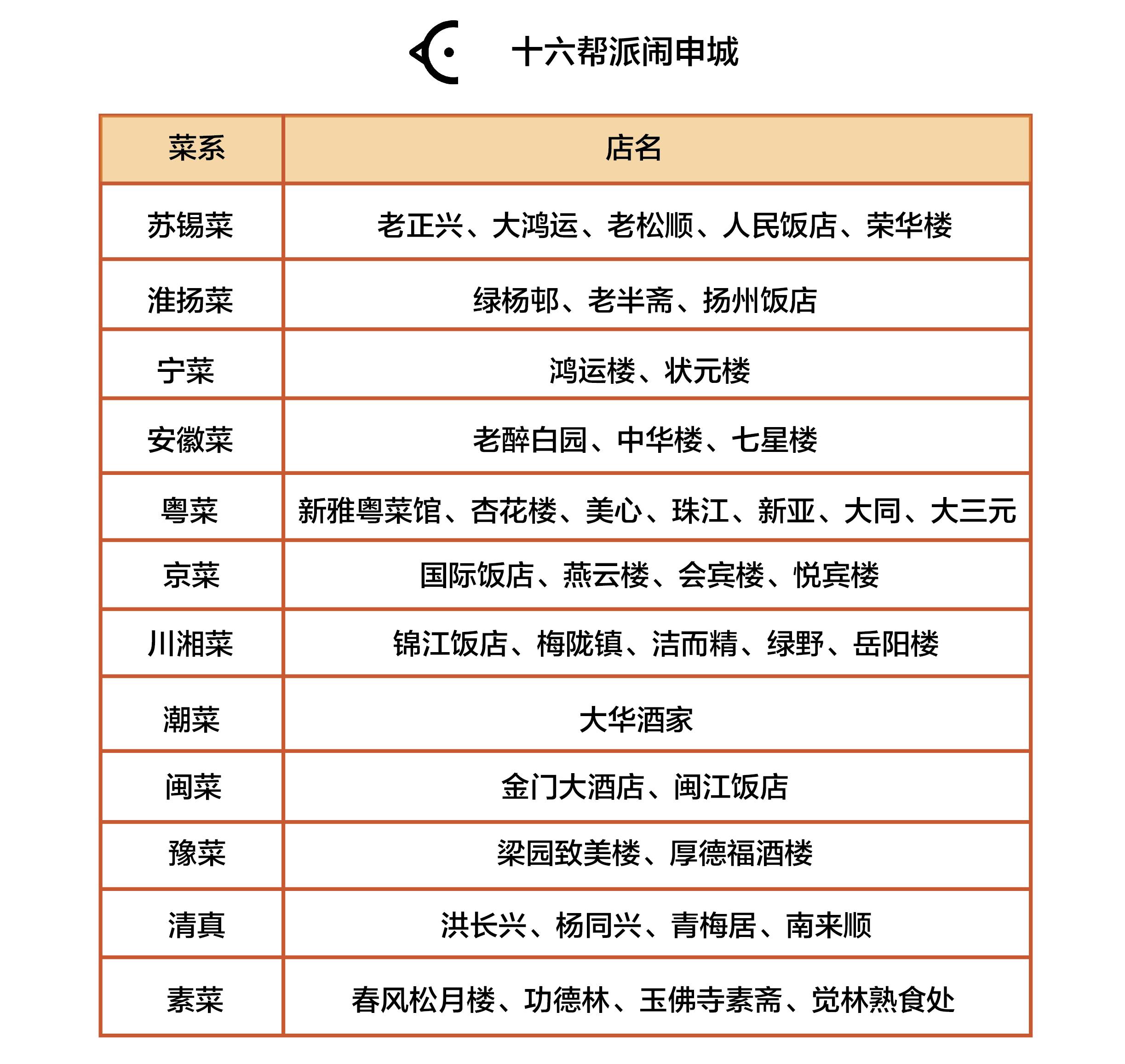 自此,各地菜馆相继入沪,抢滩大上海,申城一时菜馆林立、名厨云集,名菜荟萃、百味飘香——史称:十六帮别闹申城。它们是: