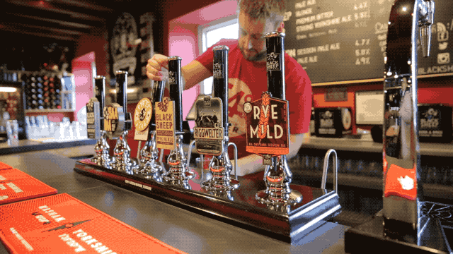 到了英国,肯定要喝一下当地生啤,就是黑羊酒厂这种按一下天鹅管,从酒头(Tap)打出的啤酒,另一端会与对应的酒桶相连。
