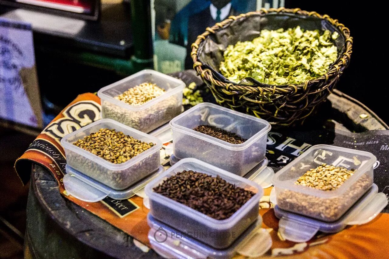 你可以亲自尝尝淡色麦芽(Pale Ale Malt)、水晶麦芽(Crystal Malt)、巧克力麦芽(Pale Chocolate Malt)和烘烤大麦(Roasted Malt)的区别。老太太告诉我们,在二战物资短缺的时节,英国人会用巧克力麦芽泡水来模拟咖啡。