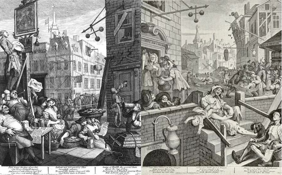 1751年,画家荷加斯(William Hogarth)画了两幅画,分别名为“啤酒街”与“金酒小路”。前者中的人民相亲相爱,和谐欢快,而后者民不聊生,酗酒妇女甚至连自己的婴儿也撒手不管。