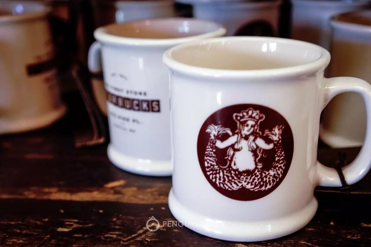 你还可以在这里看到最早的双尾美人鱼logo,仍带着古老图腾的神秘意象。识货的人会买下一个咖啡杯回去收藏——这款杯子,可只有在第一家门店才能买到呢。