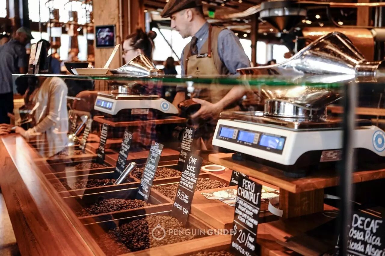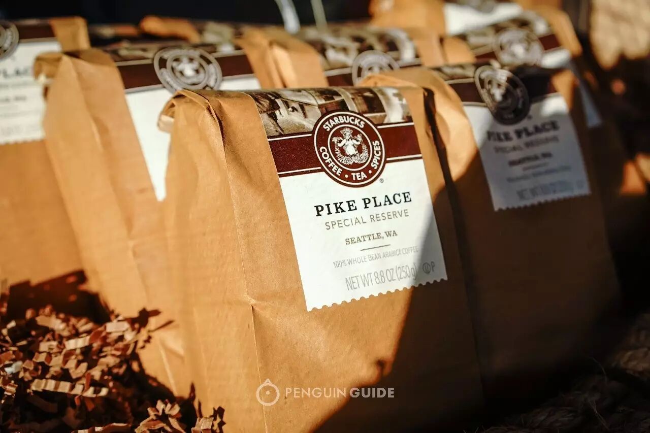 虽然人潮拥挤,但你至少还能在货架边上,追怀最初那个售卖咖啡豆的小店模样。这里提供不同产区的咖啡豆,还有独一无二的“Pike Place”包装。