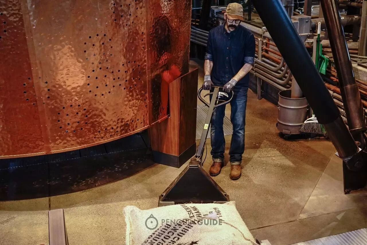 它离华盛顿会展中心不远,地下是一间宽敞的开放式工厂,管道蜿蜒盘旋,咖啡烘焙机不知疲倦地运转,烘好的豆子落入巨大的铜制储存罐,撞出雨点般的哗啦脆响。