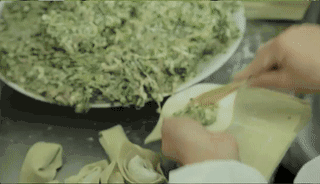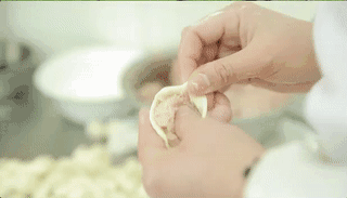安坐桌前,用刮板挑起肉馅抹在左手的馄饨皮上,顺手一捏即成型,馄饨下摆有如纱裙,半透明,层层叠叠,随风决然可以略略飘舞,师傅随手一甩,馄饨便如蝴蝶飞舞般入锅,师傅手势快如闪电,几个师傅同时做,馄饨在空交相飞跃穿梭,目不暇接,而师傅则谈笑风生全不在意。