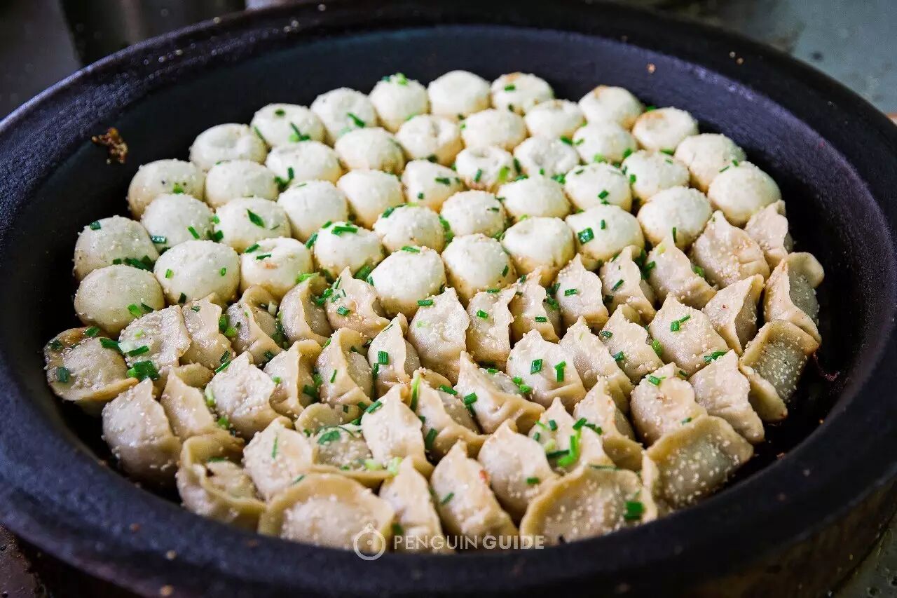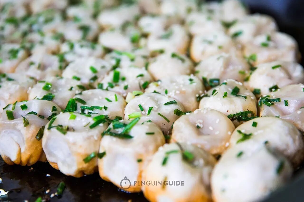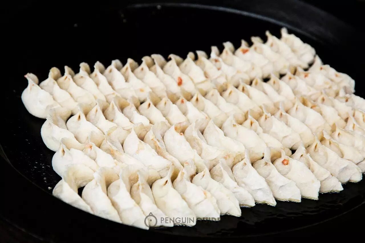 锅贴全国各地都不少,但你也很容易栽进陷阱。比如,锅贴只有不发酵的死皮,用开水和面擀成。如果看到生煎锅贴一块儿煎,多半不用尝试了: