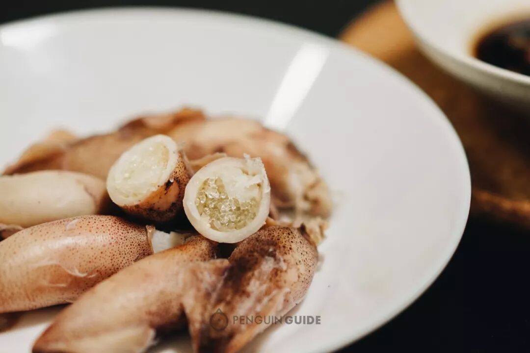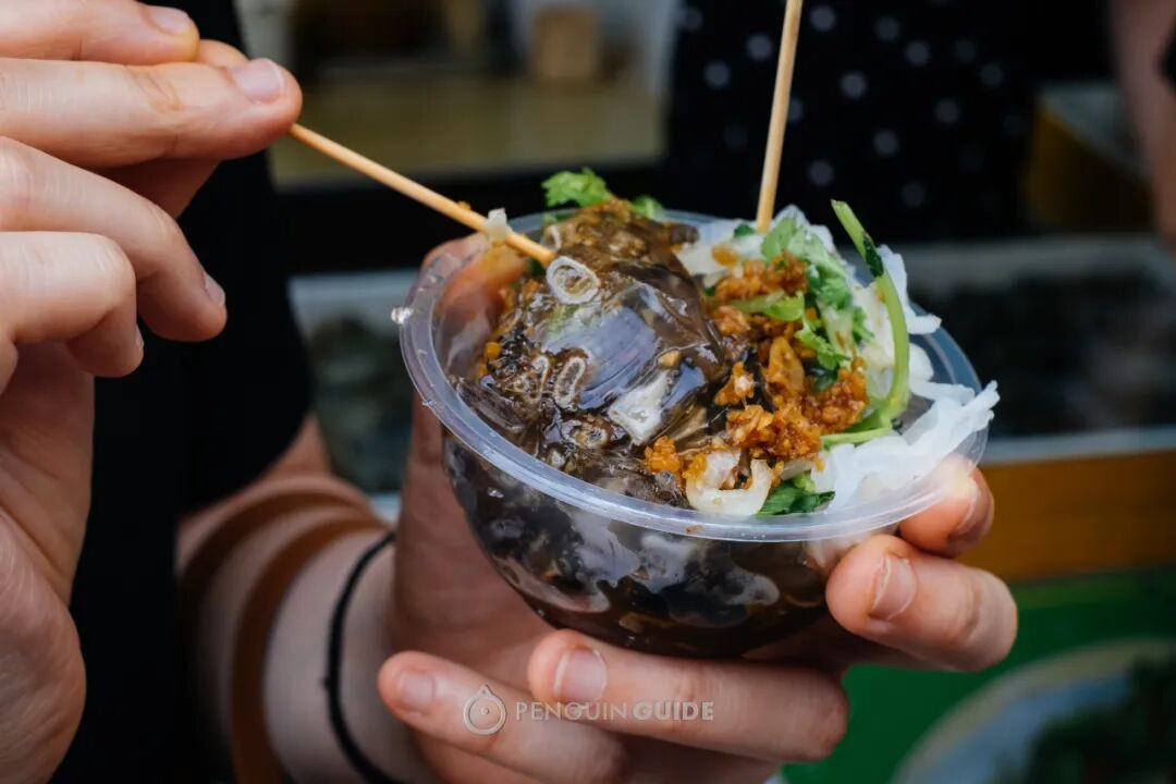 咸水鸭旁边不远的惠林土笋冻,没有明胶熬出的塑料感。土笋新鲜饱满,菜头酸和蒜蓉酱都清清爽爽。