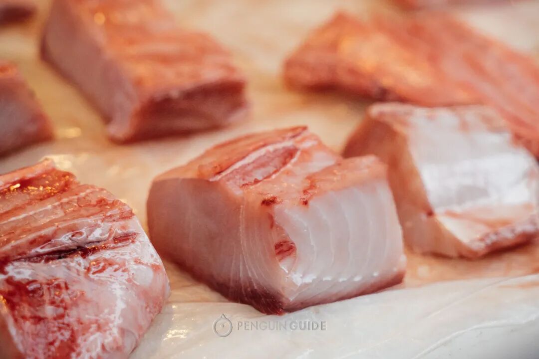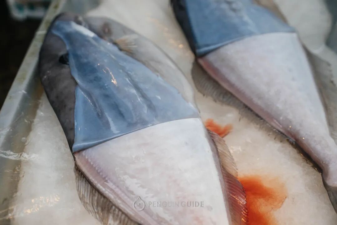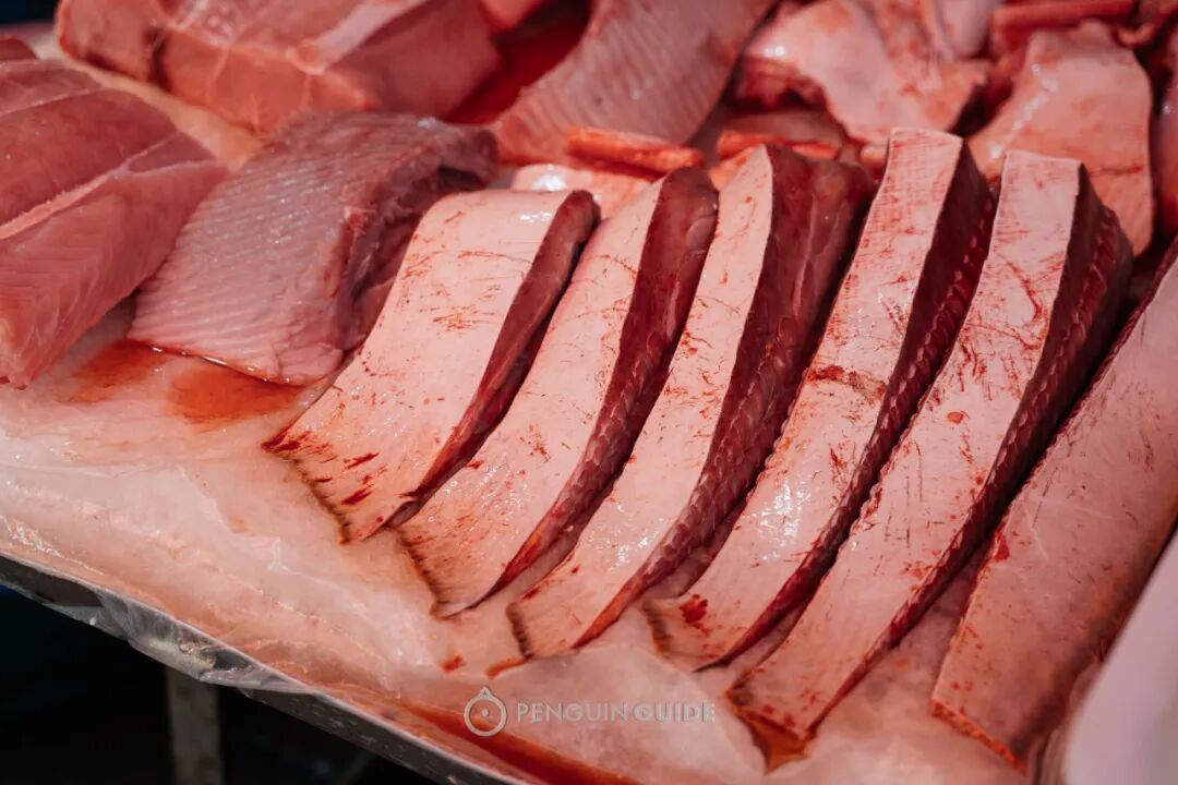 然而,这都还算是中小型鱼喔。真正的大型鱼,切了块才能放在摊位上,乍一看,还以为闯进了肉铺。