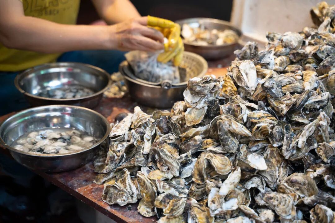 不少摊位上,牡蛎壳堆成小山。摊主刀身一起,牡蛎初见天日,像圆滚滚的白玉,温润丰腴……