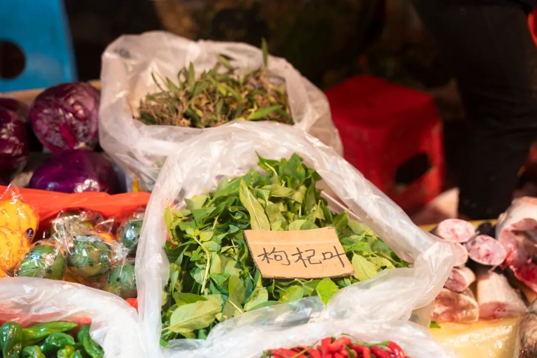枸杞叶略带清苦,当地人会在夏天拿来搭配猪肝、瘦肉或是小肠,一起煮汤。