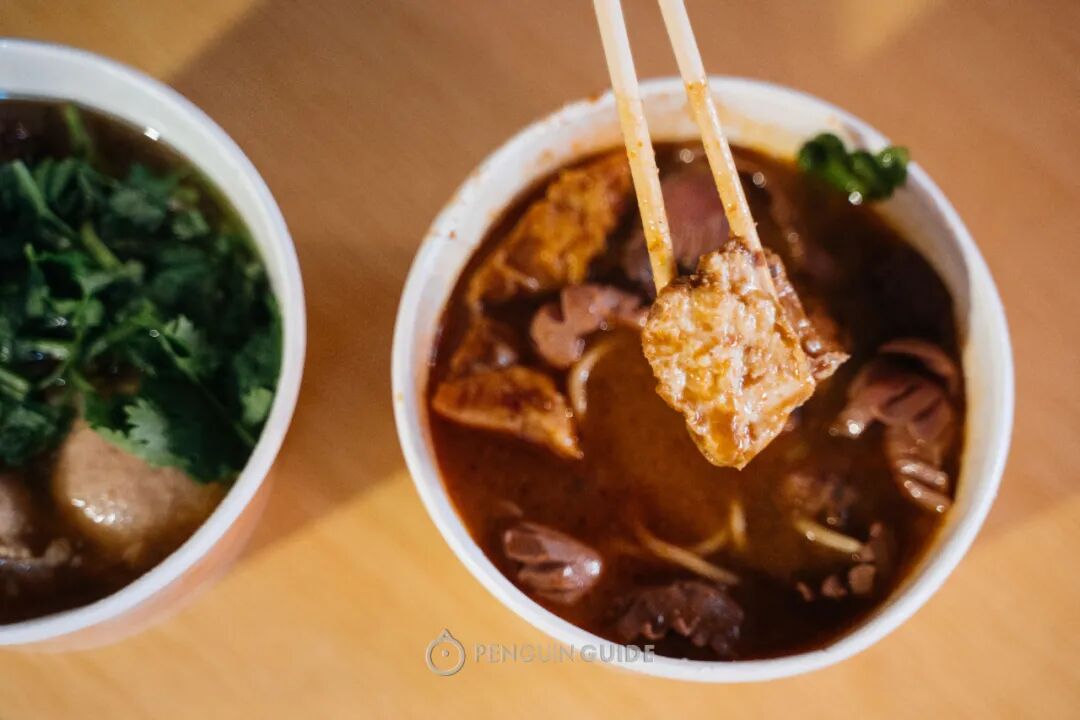 沙茶面的汤头留了不少花生碎,吃起来有沙沙的颗粒质感。豆干卤得尤其好,汤汁吸得饱满,在口中扑簌簌飙汁。