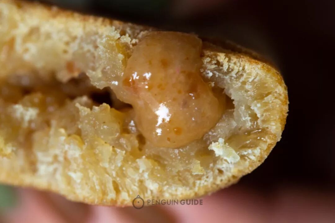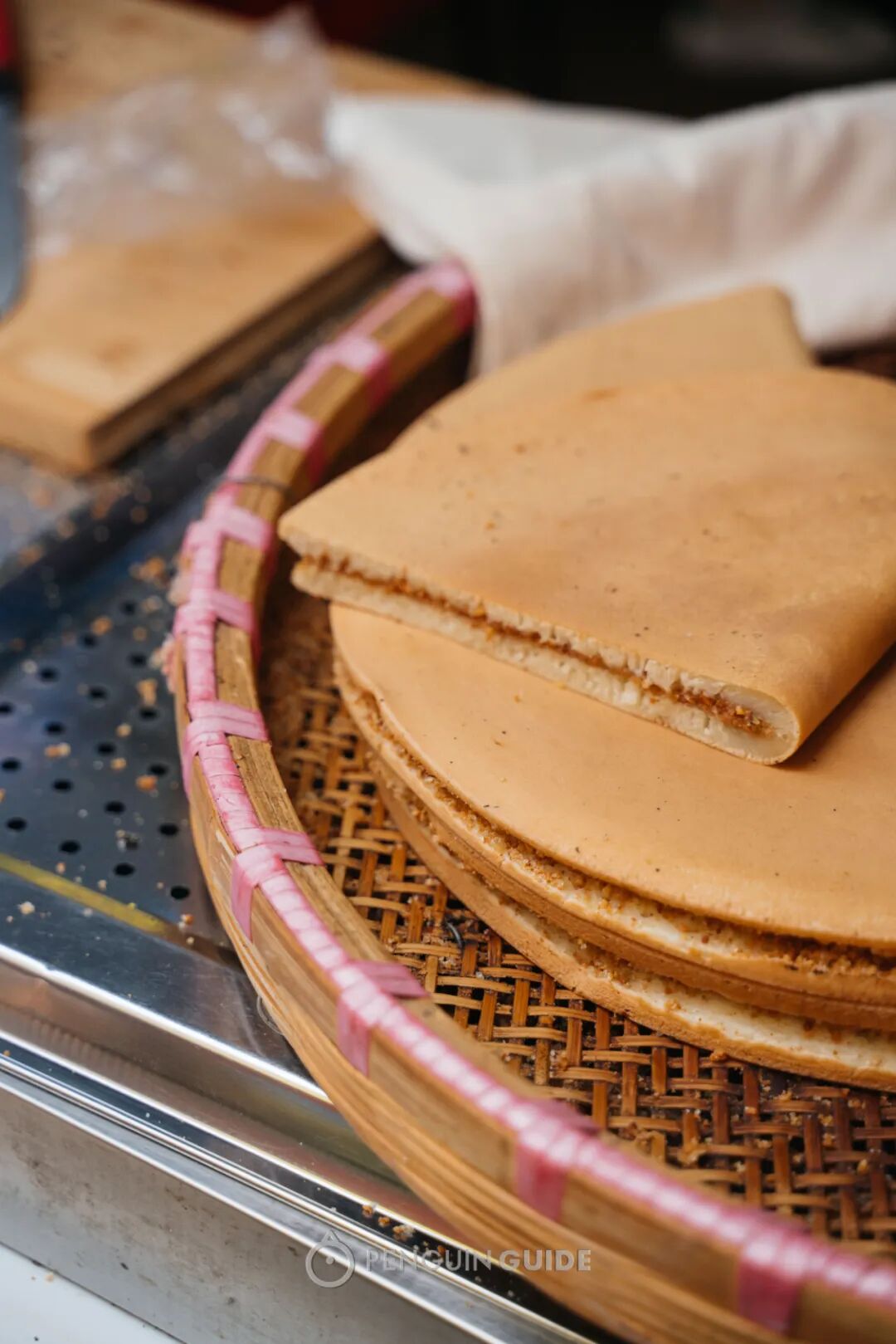 刚出炉的满煎糕,烘得金黄喷香。外层的口感有点接近铜锣烧,中间是红糖花生碎,口感疏松像黄金糕。一口咬下,花生和红糖被热气半融,小小爆了个浆: