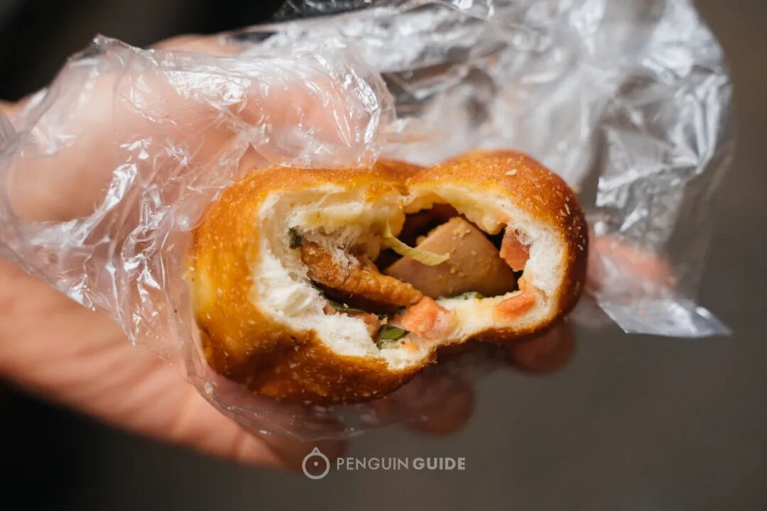 热腾腾的炸面包裹着薄薄一层椰丝,被炸得油香酥脆,内里是满满的葱花火腿,大半个卤蛋藏在深处。