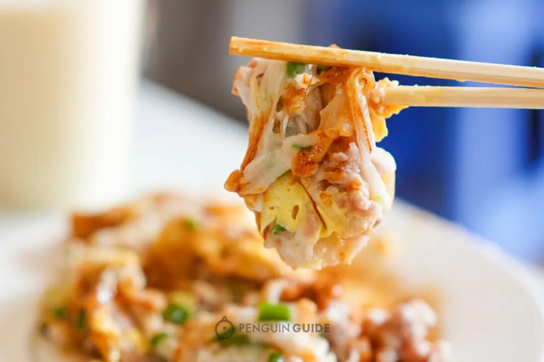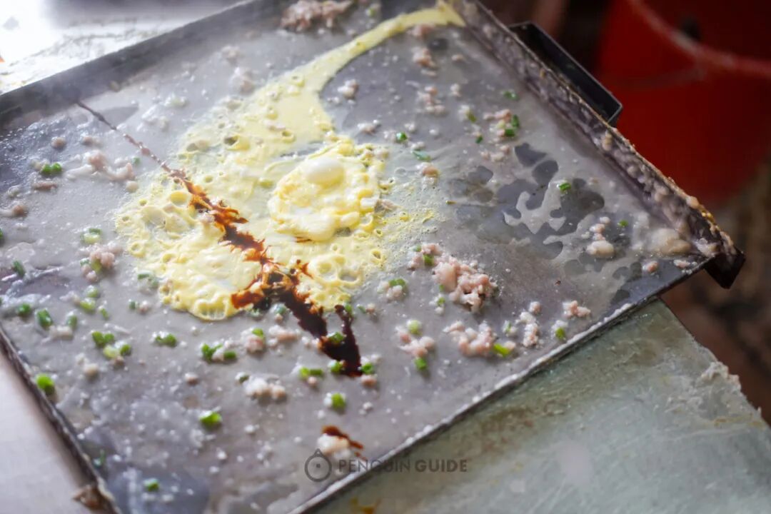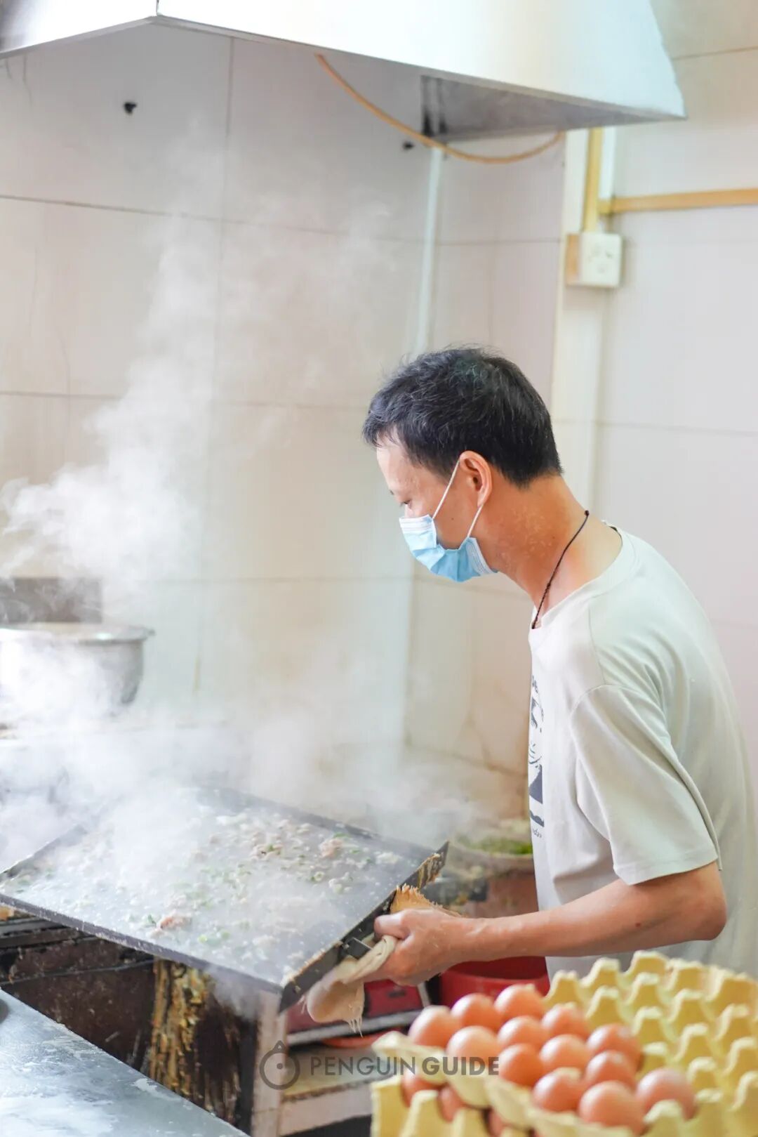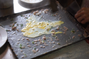只有熟练的师傅,对时间把握极其精准:不等全熟就迅速刮下,靠余温把肉码和蛋焖熟,才能做到极致的嫩,仿佛初生婴儿肌。