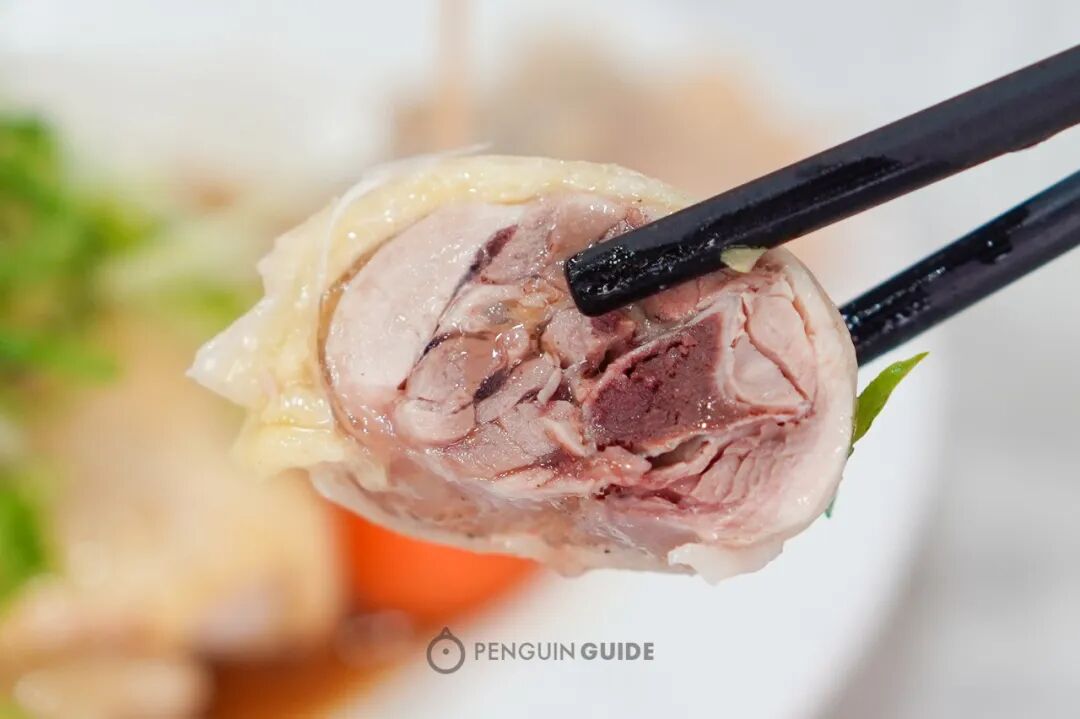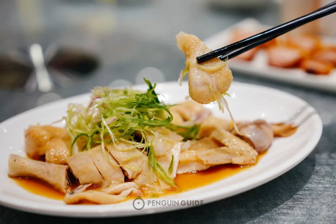 做法跟广州白切鸡有点像,鸡皮跟鸡肉之间还有晶莹的啫喱冻,芝麻酱香浓郁,吃起来满口生香,不负其名。