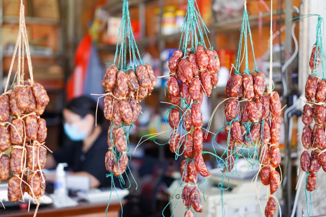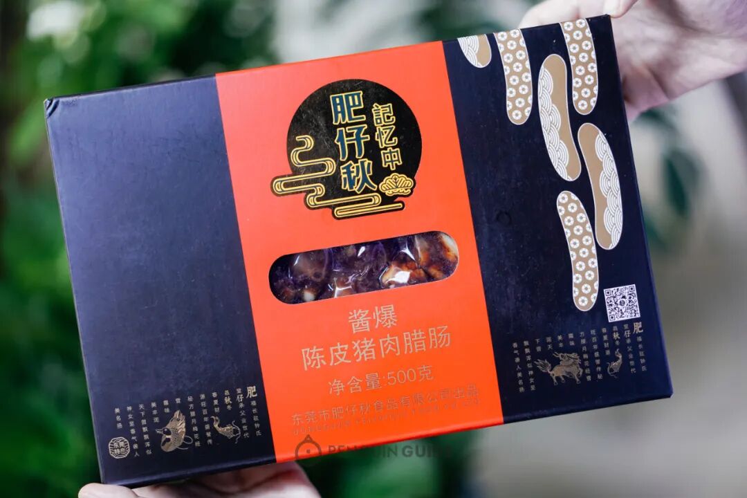 东莞腊肠的形状是矮胖矮胖的,很好辨认,汾酒下得重,打开就能闻到浓浓酒香。