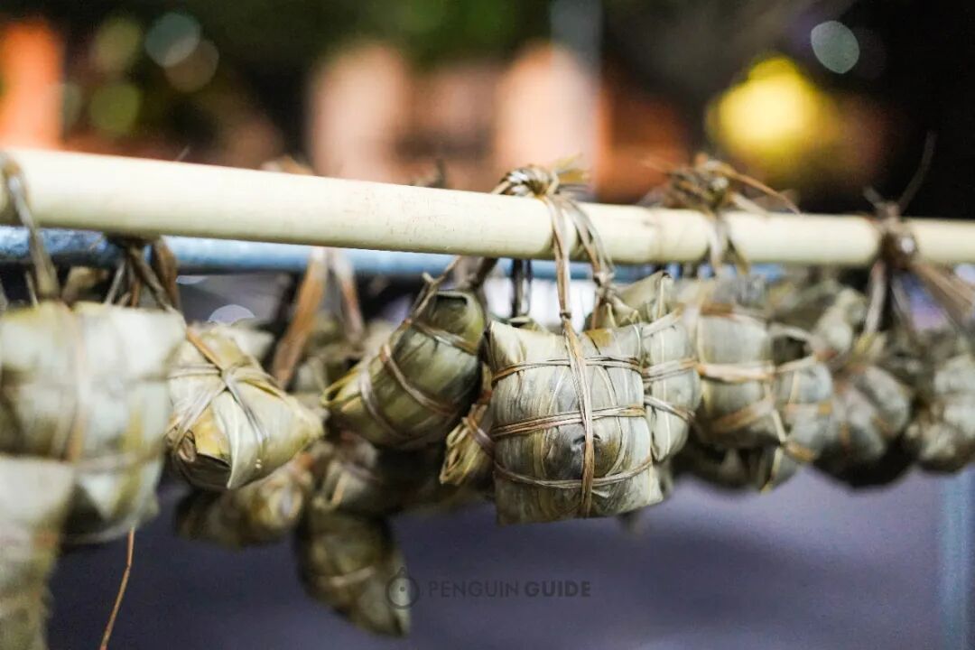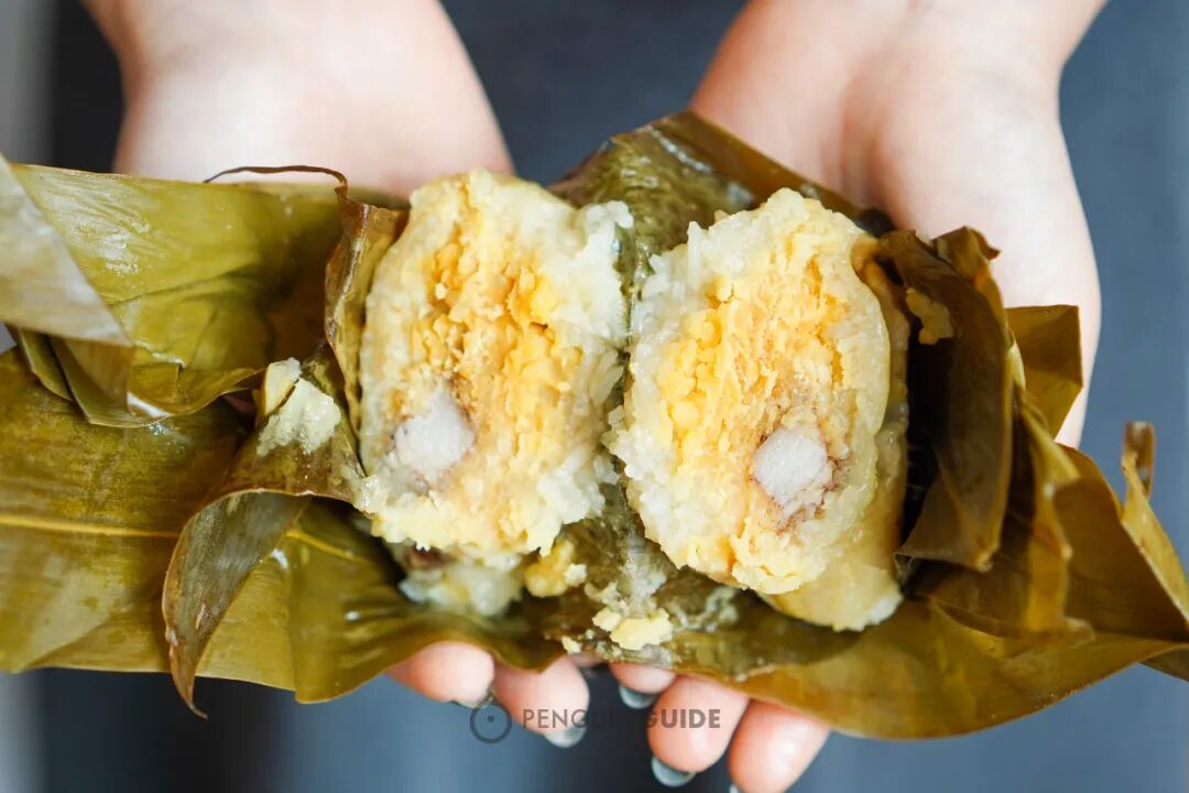 这枚道滘(Jiào)粽, 有甜甜的肥肉,配上微咸的绿豆和糯米,咸甜交织,第一次吃的人可能不太适应。