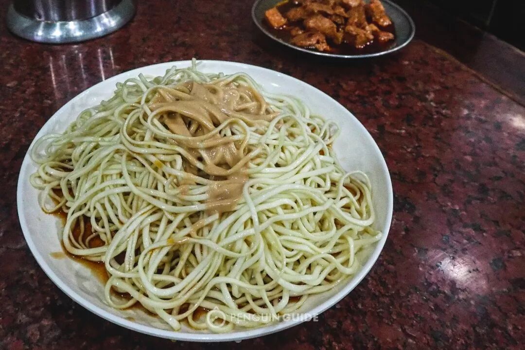 花生酱里透着一丝甜,和米醋融合后,如糖醋汁般开胃。三丝好吃,辣肉偏甜,不妨试试她家的现炒浇头。