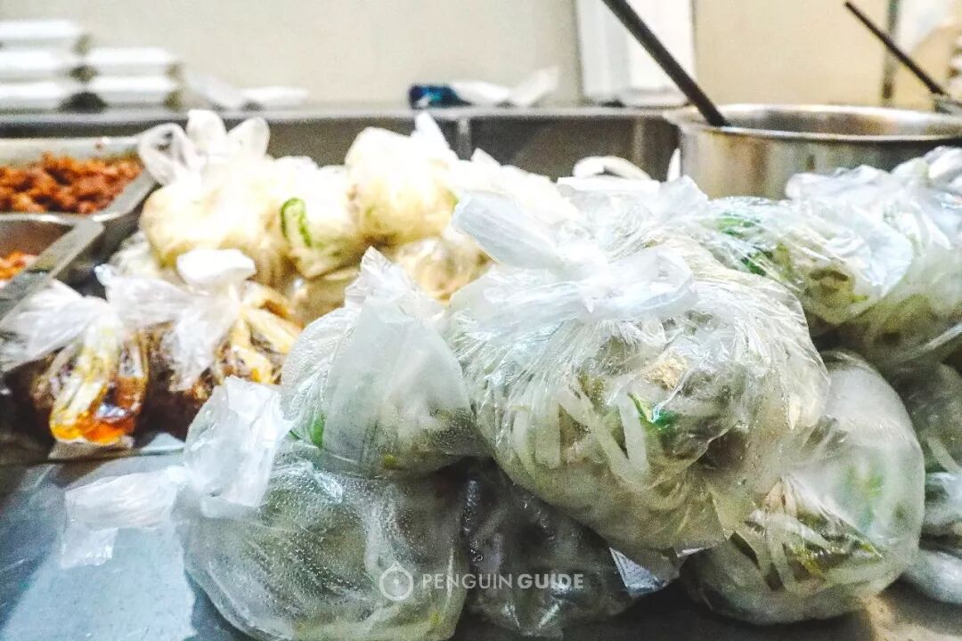 四样卖得最火的浇头:豆芽三丝、茭白三丝、素面筋、辣肉,提前分装好,调料、面条也称量打包。外带订单一来,按份数直接装就行。