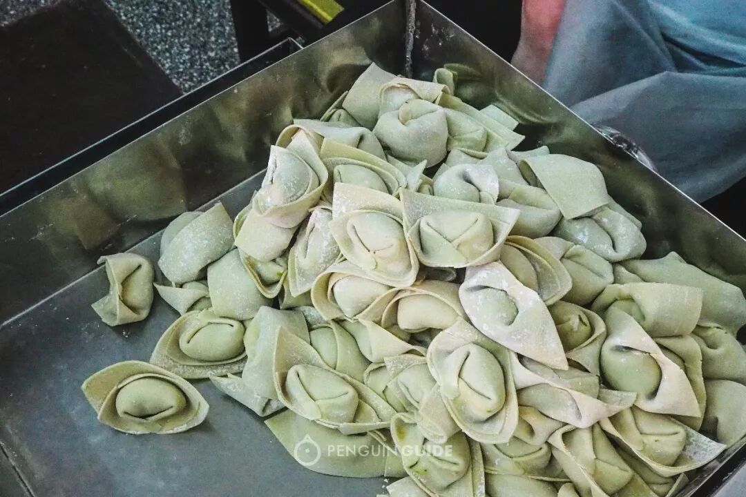 同样是颜色发灰的碱水面皮,做冷面不够弹滑,做馄饨就韧劲十足,放凉了吃更爽。生的熟的都卖得好,阿姨要不断地包。