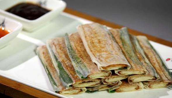 葱包桧的制作方法极其简单:将油条和小葱裹在春饼内,放铁锅上压烤至春饼脆黄,配上甜面酱和辣酱,即可食用。