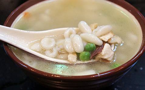 要知道,这猫耳朵的精华可全在那碗汤里!用调羹捞一下,就能见到红的火腿丁,绿的豌豆,白的虾仁,还有干贝和笋丁等真材实料。朴素的外表之下藏着杭帮菜的丰富和精致,一碗小面食能做成这个样子,恐怕也只有在江南了吧。
