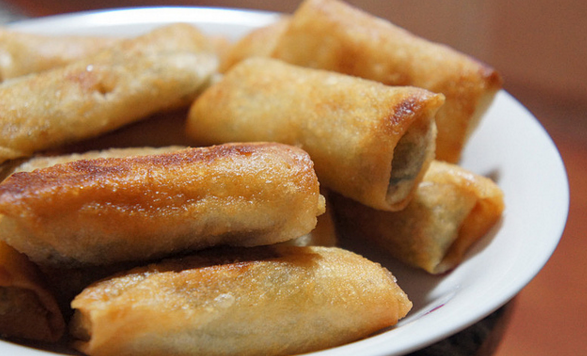 春卷由古代春饼演化而来,过去是待客的一道菜。春卷馅料可以咸,也可以是甜的。甜的简单一些,就是细腻的豆沙。咸的则通常由香干丝、冬笋丝、雪菜、香菇拌成,馅料汤汁多,吃到的是妈妈味道。