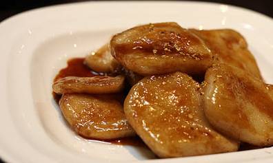 将年糕切成薄片,入油锅煎至起泡回软,入红糖、桂花,初看带着剔透的糖色,晶莹透亮,尝一口,甜香糯软,又有嚼劲,还带着淡淡桂花香,实在好吃。并且食材非常简单,是最能体现杭州老传统的一道甜品。