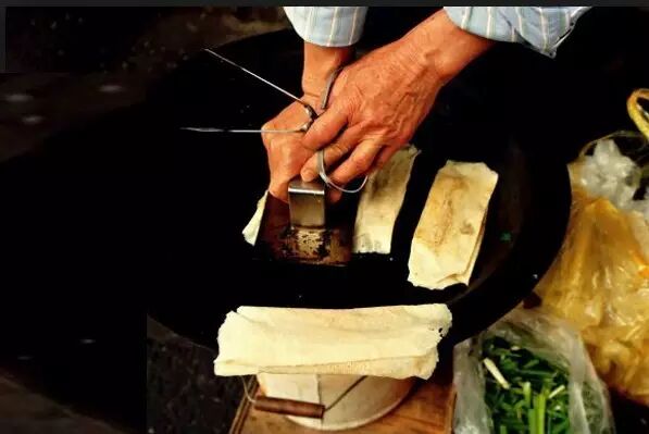 简单说,就是把锅烧热,把面糊倒进锅内,贴着锅底摊薄摊匀,煎至两面金黄。面糊慢慢结成一层面饼,有点儿像摊鸡蛋饼。火候把握是关键。