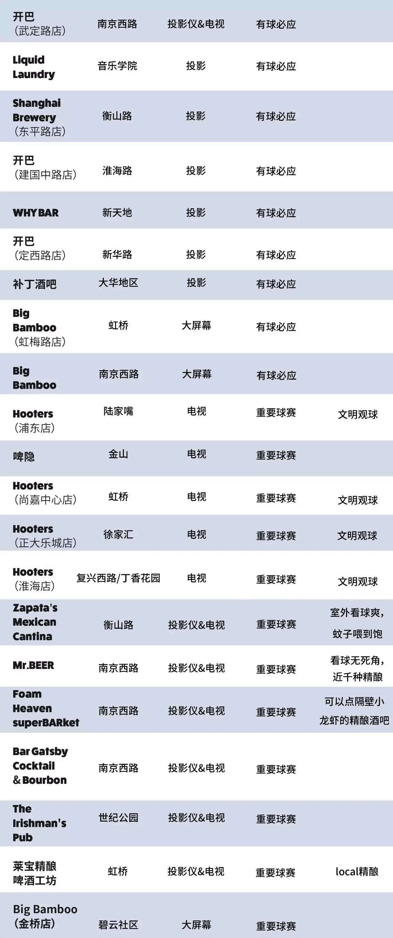 51家实在太多,会从环境、饮品、食物各方面考量,保证大家都能找到自己想要的看球氛围。