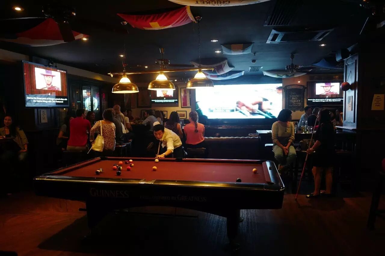 谈起看球赛,Camel Bar绝对称得上是教科书一般的足球酒吧。门面上是教科书式的赛程落地海报。店内教科书式的球迷设备:大屏幕、桌球台、飞镖机和桌上足球,一应具全。教科书式的装饰:木质地板,木质桌台,还有满墙的球衣和球星海报。电视机会时不时地插播竞猜游戏,猜中了会送啤酒和威士忌。