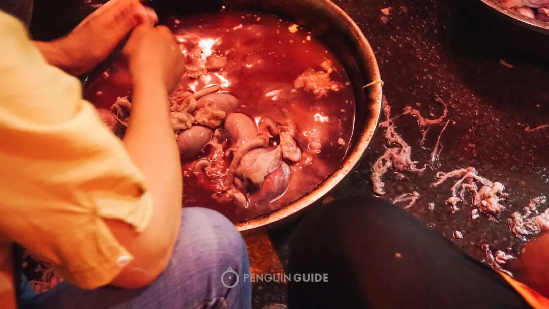 厨子们5点起床熬羊肉汤,晚上9点还在厨房门口处理羊肉。