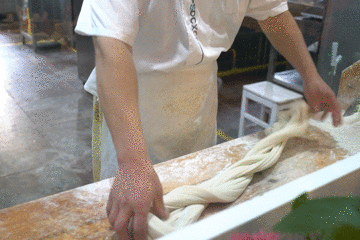 这两碗的面,都很讲究,是摔出来的。在面馆里,你能看到师傅两手持着面团,一抻一拉,再将面团狠狠摔向案板。不断重复,这面才能有劲道。