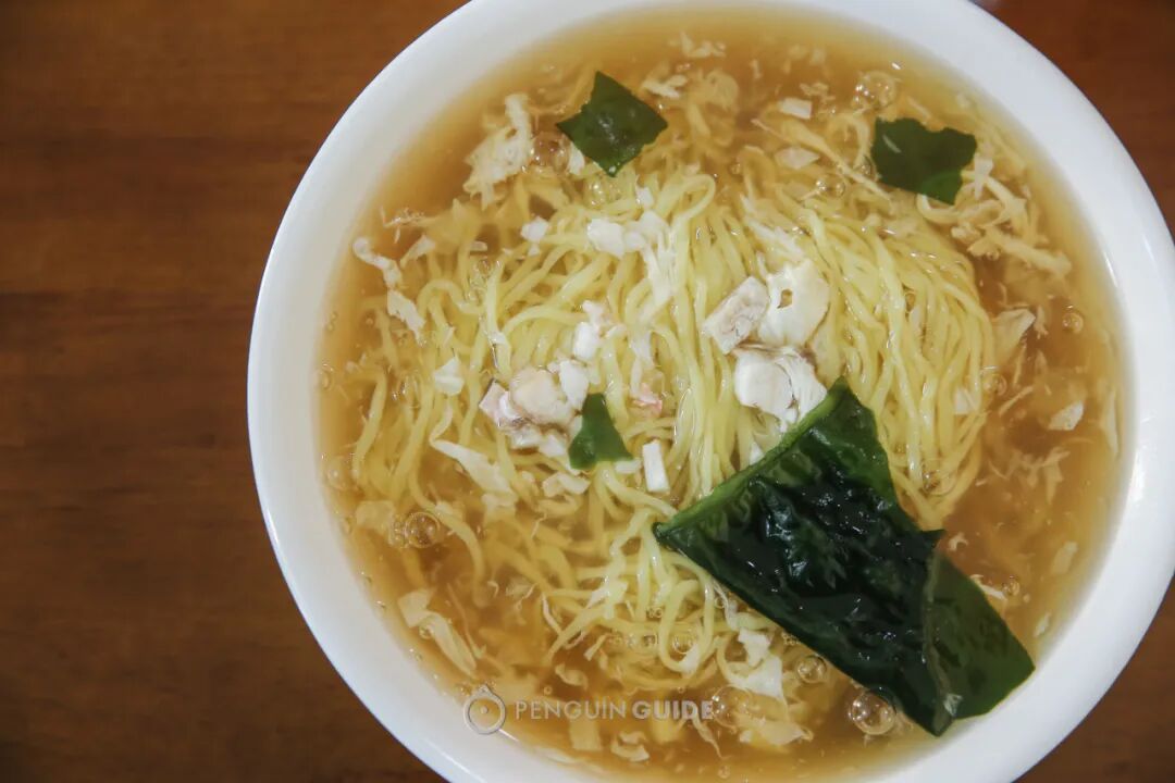蓬莱小面的面卤很严格,一定要是蓬莱产的加吉鱼。把鱼片和鸡汤一起煮,加上各种佐料,再飞上鸡蛋花,芡上淀粉,蓬莱小面的鱼卤就做好了。