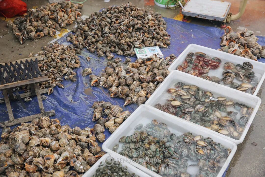 海鲜市场专卖螺类贝类的,摊子上有一座座小山,海螺按大小分批,花蛤、蚍蛴、蛏子,各种花纹争奇斗艳。